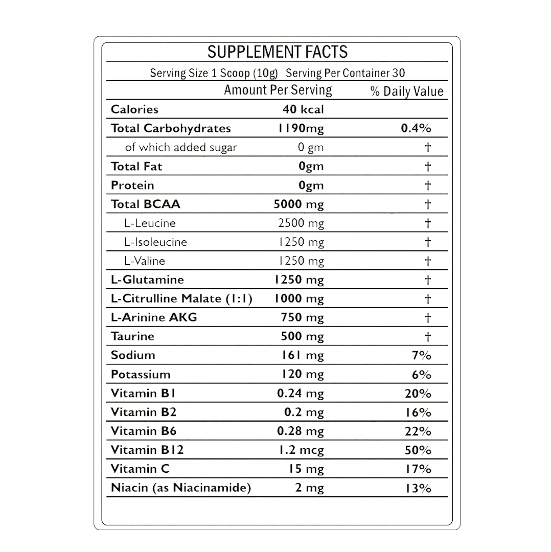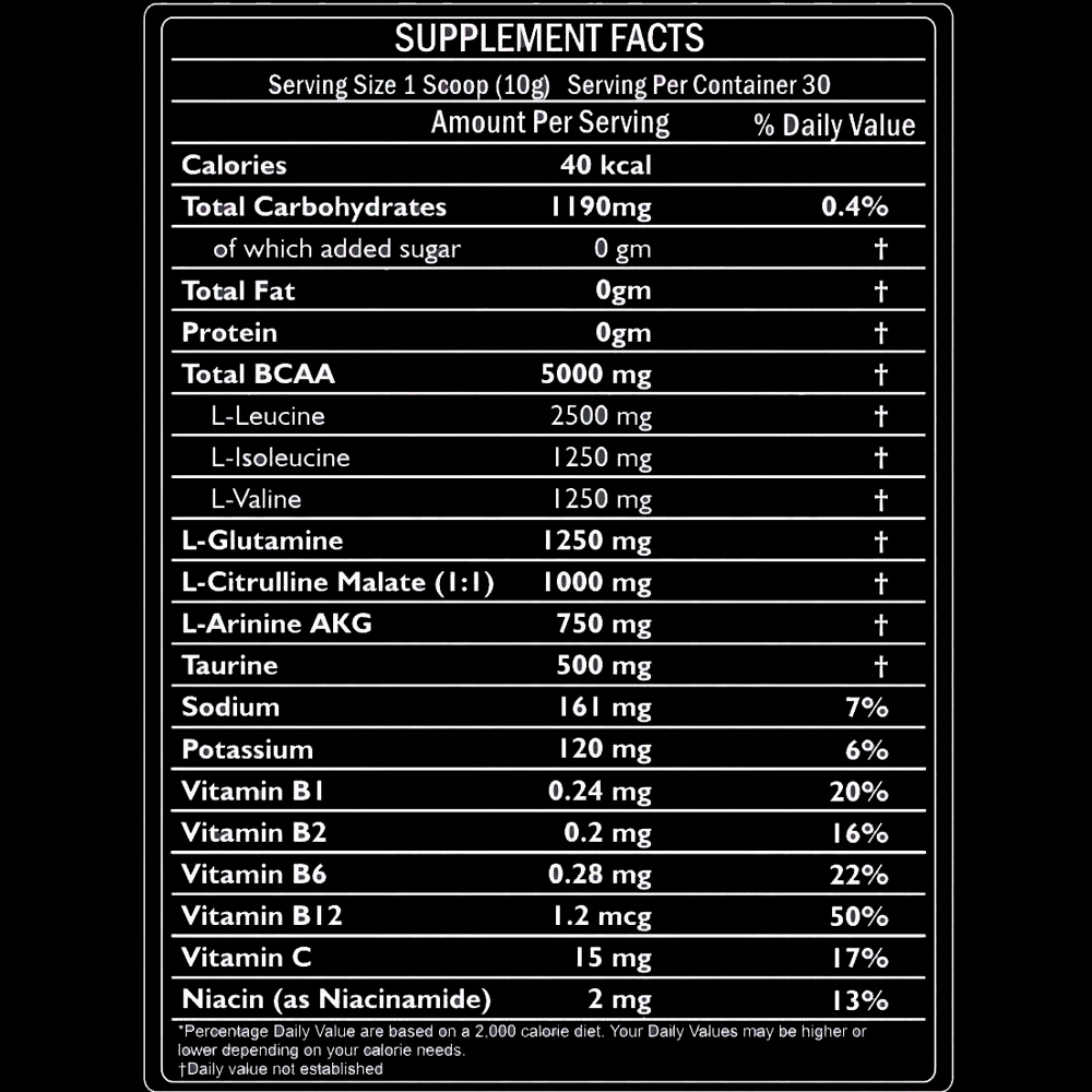 Branched Chain Amino Acids, L-Glutamine, Taurine, L-Citrulline Malate, L-Arginine AKG, Malic Acid (INS 296), Sucralose (INS 955), Thickener (INS 415), Potassium Chloride, Sodium Chloride, Preservatives (INS 282), Anticaking Agent (INS 551).